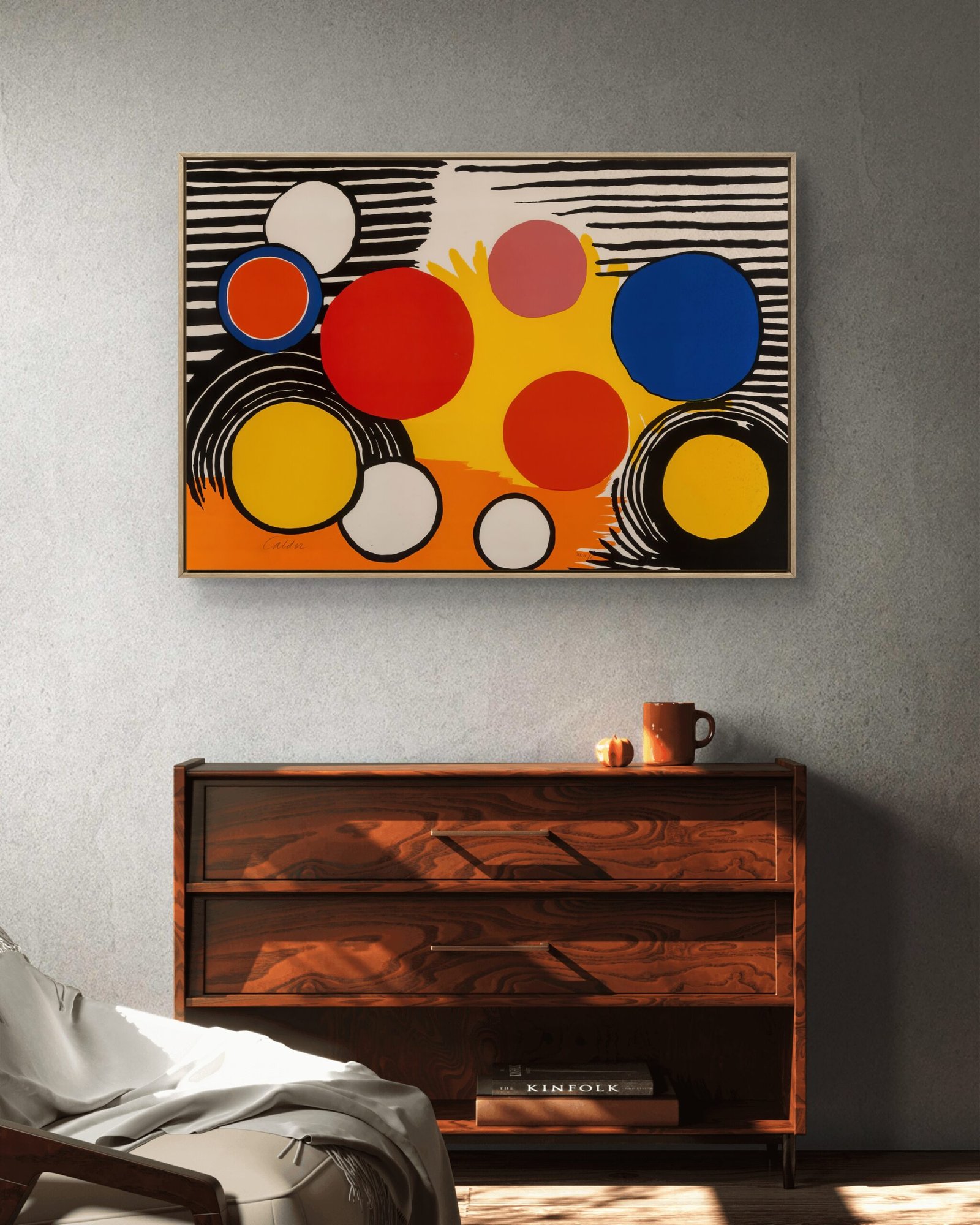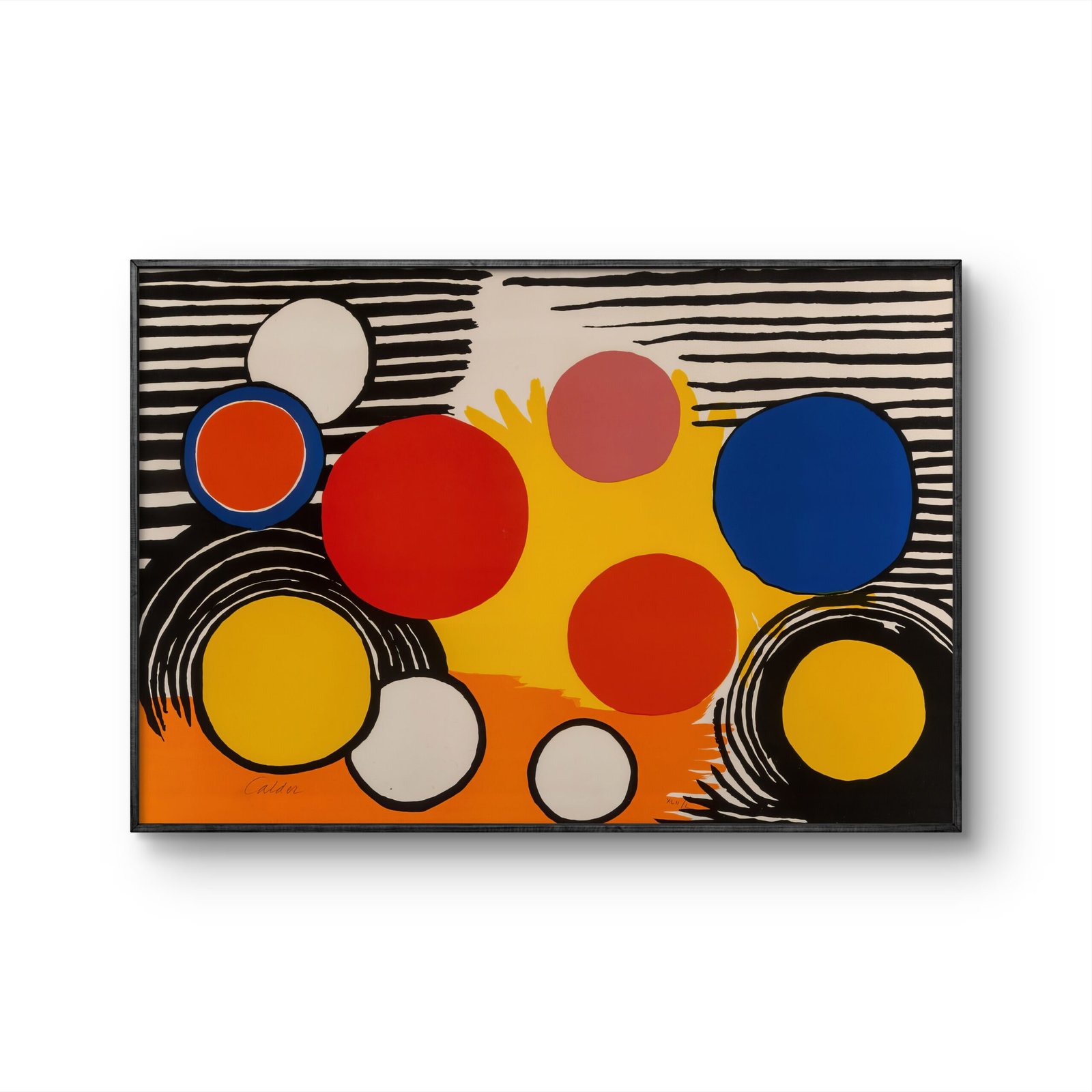 a framed abstract artwork featuring a vibrant composition of circles in various sizes and colors